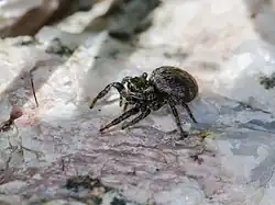 First circumscribed by Eugène Simon in 1902, Evarcha is one of the largest genera of jumping spiders, with members found on four continents.[5] In 1976, Jerzy Prószyński placed the genus in the subfamily Pelleninae, along with the genera Bianor and Pellenes.[6] In Wayne Maddison's 2015 study of spider phylogenetic classification, the genus Evarcha was moved to the subtribe Plexippina.[7] This is a member of the tribe Plexippini, in the subclade Simonida in the clade Saltafresia.[8] It is closer to the genera Hyllus and Plexippus.[9] Analysis of protein-coding genes showed it was particularly related to Telamonia.[10] In the following year, Prószyński added the genus to a group of genera named Evarchines, named after the genus, along with Hasarinella and Nigorella based on similarities in the spiders' copulatory organs.[11] In 2018, Prószyński attempted to split the genus, but this has proved controversial and has not been universally accepted.[12]