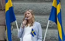 ![]() Evelina Hahne speaking at Alternative for Sweden's meeting on Mynttorget in Stockholm on 9 August 2022 | |