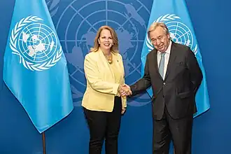 As the previous government ran a government budget deficit, Wever-Croes shortly after taking office announced that she wanted to introduce budget cuts and initiate talks with the Netherlands about future financial agreements.[5] One of her first measures was to limit the staff attached to each minister.[6] By the next year she had put a cap on government salaries and hoped to put forward a financial recovery plan in June, to avoid an intervention by the Dutch government.[9] In November 2018 Aruba and the Netherlands agreed on budgetary rules for the period 2019–2021 and to have the College Aruba financieel toezicht (CAft) be in place for at least a further three years.[10][11] Under Wever-Croes an accord was reached in 2019 on an Aruban fiscal council to succeed the CAft per 2021.[12]