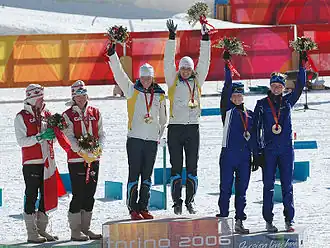 The medal ceremony for the women's team sprint in cross-country skiing. Left to right: Sara Renner and Beckie Scott (silver); Lina Andersson and Anna Dahlberg (gold); and Aino-Kaisa Saarinen and Virpi Kuitunen (bronze).