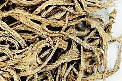 Evernia is a genus of bushy lichens in the family Parmeliaceae.[1] Oakmoss Evernia prunastri is used as a fixative agent in Eau de Cologne within the perfume industry. It is green on top and white on bottom, and divides evenly into "forks"; it becomes very soft when wet. It is not to be confused with Ramalina, which is straplike, stiff and bristly, green on top and bottom, and divides unevenly. Evernia is an abundant genus, found growing on trees.[2]