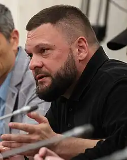Evgeniy Evgenyevich Poddubny (Russian: Евгений Евгеньевич Поддубный; born August 22, 1983) is a Russian war correspondent, propagandist, and special correspondent for the Russia-24 and Russia-1 television channels.[1] He was born in Belgorod, and received a master's degree in psychology and has worked as a war correspondent for Russian state television. He has covered Russian conflicts in Georgia, Syria, as well as in Ukraine. For his work, he has received sanctions by both the United Kingdom, and Australia who accuse him of disinformation on behalf of the Russian government. In August 2024, he received injuries after his vehicle was struck with a loitering munition while covering the August 2024 Kursk Oblast incursion.[2]