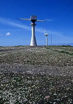 The five wind turbines on Burgar Hill in Evie are visible from a large part of the West Mainland. Established in 1983, Burgar Hill Wind Farm was one of the first wind farms in the UK.[4]