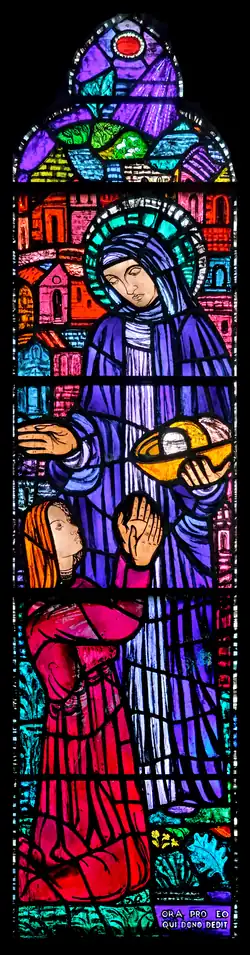- St Mura’s Parish Church, Fahan, County Donegal: Memorial window for Mrs W. A. Dickson, depicting Elizabeth of Hungary, 1949.[18]