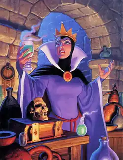 Early concepts for the film called for a "fat, batty, cartoon type, self-satisfied" Evil Queen. However, Walt Disney became concerned that such an approach would make the character seem less plausible. Sensing that more time was needed for the development of the Queen, he advised that attention be paid exclusively to "scenes in which only Snow White, the Dwarfs, and their bird and animal friends appear."[17] Disney further developed the main plot himself (Ollie Johnston said the film's story was based on the idea that the Queen's character was going to murder "another drawing" and Disney decided to make it appear believable[18]), finding a dilemma in the characterization of the Queen, whom he envisioned as a mixture of Lady Macbeth and the Big Bad Wolf,[19][20] and decided to set on "a high collar stately beautiful type"[21] whose "beauty is sinister, mature, plenty of curves – she becomes ugly and menacing when scheming."[13] According to a description in her card in the Disney Villains set, "the Witch's ugliness symbolises the evil disguised by the Queen's beauty."