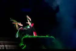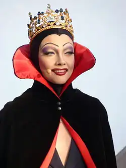 In the Disney Villains Mix and Mingle and Mickey's Boo-to-You Halloween Parade shows during Magic Kingdom's Mickey's Not-So-Scary Halloween Party, the Queen is one of the villains led by Maleficent that appear during the Cinderella Castle Forecourt Stage.[79][80] Susanne Blakeslee voiced the Queen at 2001's Share A Dream Come True Parade, where she could be seen transform herself into a hag.[81] The Evil Queen is one of the "favourite" villains included in Magic Kingdom Park's special pre-parade procession "It's Good to be Bad" a night before the annual Main Street Electrical Parade.[82] One event featured a giant interactive mirror and included the Queen and two other "Divas of Evil", Maleficent and Cruella de Vil.[83] She also prominently appears at Villains Unleashed party,[84][85] a separately ticketed event at Disney's Hollywood Studios that was introduced in 2014.[86]