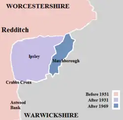 The outliers were not the only boundary realignments as part of the Act. The south western tip of Worcestershire at Redmarley D'Abitot and Staunton was transferred to Gloucestershire,[87] while the county gained the parish of Ipsley from Alcester Rural District in Warwickshire (See Fig 7), which was added to the expanding Redditch Urban District.[88]