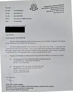 74. ^ "S'porean Inmate On Death Row Has Been Hanged, Mum Visited Him A Day Before Execution". Must Share News. 26 April 2023.