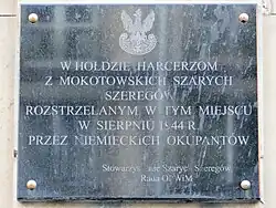 From 5 August, as more buildings fell into German hands, mass executions were also carried out near the modern-day site of the building at 27/35 Marszałkowska Street. Among the victims were scouts from Mokotów's Grey Ranks.[33]
