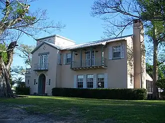 It is a two-story, Mediterranean Revival style house with a three-story square tower with an irregular floor plan at one corner. The exterior walls have a stuccoed finish, resting on a concrete slab foundation, and are covered by cross-gable, hip, shed, and flat roof components. Tar and gravel is used for the flat roof; asphalt shingles cover the remaining roofed surfaces. The house is constructed of wood frame, covered with stucco.