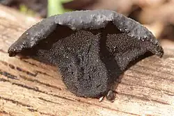 Exidia glandulosa forms dark sepia to blackish, rubbery-gelatinous fruit bodies that are top-shaped (like an inverted cone) and around 3 cm (1.2 in) across (sometimes fusing into masses some 20 cm in length).[10] They are firm when fresh, but become lax and distorted with age or in wet weather. The fruit bodies occur singly or in small clusters. The upper, spore-bearing surface is shiny and dotted with small pimples or pegs. The undersurface is smooth and matt at first, but develops a dense covering of small, gelatinous spines. The fruit bodies are attached to the wood at the base. The spore print is white.[11] When the fruit bodies are dried they can shrink to form a flattened black crust.[4]