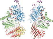 The crystallization of the exon junction complex has revealed the structural organization of its protein components. The core of the complex is elongated with an overall dimension of 99Å by 67Å by 54Å.[21] It is organized around the eIF4AIII factor. The factor itself consists of two different types of conformations around the mRNA: closed and open. In a closed state, the two domains of eIF4AIII form composite binding sites for the 5'-adenylyl-β,γ-imidodiphosphate (ADPNP) and mRNA.[21] In the open conformation, the two domains are rotated by 160 degrees relative to closed state.[18] The protein components Magoh and Y14 bind together to form a heterodimer located at the 5’ pole of the EJC.[22][23][24] Magoh binds to an eIF4AIII domain through interactions between residues from its two C-terminal helices and one end of a large β-sheet.[21] Conserved residues in the linker between the two eIF4AIII domains form salt bridges or hydrogen bonds with specific residues in Magoh.[21] Other bonding occurs between the second loop of the Magoh β–sheet and the two eIF4AIII domains and their linker.[21] There is only a single partial bond formed between Y14 and eIF4AIII. This consists of a salt bridge between the conserved residues Y14 Arg108 and eIF4AIII Asp401.[21] If mutations were to occur to both of these residues, association of Magoh-Y14 with EJC would be non-existent.[25]