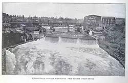 Spokane was initially settled in the late 1800s along the Spokane Falls of the Spokane River, a site which was chosen because of the falls' hydropower potential to support a late 19th century city and its economy.[7] As Spokane began to grow over its early years, the area would become heavily industrialized with numerous sawmills, flour mills,[8] and hydroelectricity generators.[9] Railroading would eventually develop around the falls by the early 20th century.[10][11]