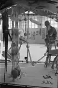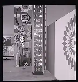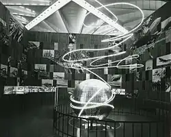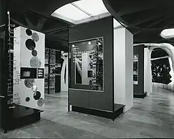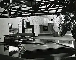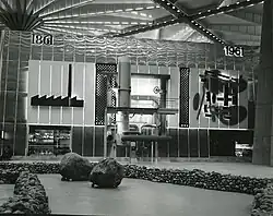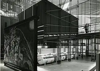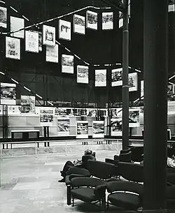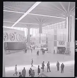 The international part of the Expo 61 was held in the purpose-built Palazzo del Lavoro (Labour Palace) designed by the Italian architect Pier Luigi Nervi. The roof is supported by 16 pillars each 25 meters high, each supporting a 38 x 38 meter concrete element. Glass panels between the concrete elements allow daylight into the 25.000 m2 hall. The walls are made of glass panels supported by a metal frame at the outside of the building.