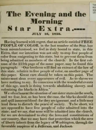 The most controversial piece, titled "Free People of Color," reminded readers to comply with Missouri state law, which required free people of color to bring proof of citizenship when settling in the state. This inflamed tensions with the Missourians, who interpreted it as evidence of the Mormons actively facilitating and encouraging the settlement of free blacks, which was seen as extremely undesirable to settlers of the newly-created slave state.[14] The Star would later publish an extra denying these allegations, arguing their intent was to deter such migration.