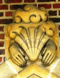 After the South Door entrance is St Ursula’s Porch with Eric Gill’s carving over it of the Diocesan Coat of Arms and by the side of the porch is a plaque carrying the name "Maufe" and a crest above it. This is the signature stone of Edward Maufe. This door is also known as the “Bishop’s Entrance” and the door handles are shaped like a bishop’s crozier.[7]