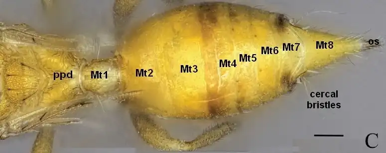 The metasoma is composed of the petiole, the initial metasomal tergum, in addition to seven or eight postpetiolar segments (terga) that collectively form the gaster (Mt2 to Mt8 or Mt9). Many chalcidoids have a very short, broad petiole, such that the mesosoma and metasoma are broadly interconnected (sessile), and the petiole may be obscured from view. Conversely, the petiole may be tubular and longer than broad, so that a distinct constriction demarcates the mesosoma from the metasoma, and the metasoma is 'petiolate'. There is a pair of functional spiracles on the seventh metasomal tergum (Mt7). Most chalcidoids also have a pair of sensory cerci, typically situated on Mt8. The cerci may be setose, finger-like projections or as low plate-like structures that bear several prominent setae (cercal bristles).The metasomal spiracles are consistently located on Mt7 when present; they can be valuable pointers for ascertaining the number of terga.[4]