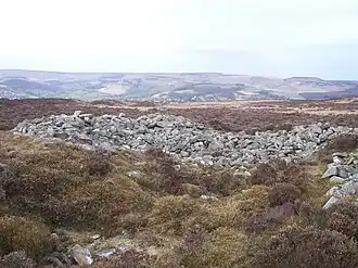 There are three stone circles on Eyam Moor. Wet Withens (known as Eyam Moor 1) is a Bronze Age stone circle at the centre of Eyam Moor with an earthen bank over 30m wide. The prehistoric henge of 10 upright stones (orthostats) is a protected Scheduled Monument.[4] The other embanked stone circle (Eyam Moor 2) on the eastern edge of the moor is also Bronze Age and is about 13m across.[5] Nearby is Eyam Moor 3, a third Bronze Age small circle of 13m diameter with six remaining free-standing stones, without an embankment.[6] Both of these smaller henges are also Scheduled Monuments, as well as numerous prehistoric cairns spread across the moor.[7]