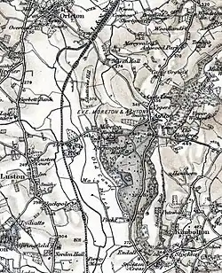 At Eye village the parish room, "an iron building", was recorded next to the railway station, and a Moravian Mission was in existence. At Luston was a Wesleyan chapel which was built in 1862. Berrington Hall in 1868 was the seat of George Bridges Harley Dennett Rodney, 7th Baron Rodney, and in 1909, that of Frederick Cawley, 1st Baron Cawley, and was described as "a mansion of stone beautifully situated in a well-wooded park of 400 acres". In 1909, in Nordan (hamlet) at the south of the Luston part of Eye parish, is recorded Nordan Hall, a "mansion of brick, pleasantly situated on the summit of the hill... with a fine prospect over the vale of Leominster", the residence of Major (later Lt-Colonel) James Gurwood King-King DSO, a veteran of the North-West Frontier and Boer War.[10][11][12] In 1868 the parish children's school was at Eye village; by 1909 the parish school was a Public Elementary School at Moreton, which had been built in 1906 to accommodate 140 children, and at the time attended by 88. At The Broad, a hamlet at the extreme south of the Luston part of the parish, was the parish post office.[6][7][8]