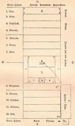 The last section of the book records the vision of the "structure like a city" seen by Ezekiel in Ezekiel 40:2.[20] These verses apparently are added from a different source, focusing the city gates on each of the four sides, and each gate is named after a certain tribe (cf. Revelation 21:12f) to complete 'a picture of perfect order and harmony'.[19] This new city is different from the Jerusalem in history, because the gates of the post-exilic Jerusalem in Nehemiah time were carefully noted, yet none was named after the tribes (cf. Nehemiah 3), although in the pre-exilic period there were a Benjamin gate and an Ephraim gate (Jeremiah 37:13; 2 Kings 14:13), but both were on the north side, not the east side, of the city.[20] Also, in the new city, Levi stands as one of the twelve tribes with its own gate, whereas Ephraim and Manasseh are represented by a single "Joseph" gate.[20] The order of gate naming seems to have its own logic, with the children of Leah on the north (Judah, Levi and Ruben) and south sides (Simeon, Issachar and Zebulun), the children of Rachel on the east side (Joseph and Benjamin, together with Dan, the eldest son of Bilhah, Rachel's handmaid) and the remaining children of the concubines (Gad, Asher and Naphtali) grouped together on the west.[20] The arrangement recalls the order of tribal camps surrounding the tabernacle, three on each of the four sides (Numbers 2), that brings the clear idea of "diverse but united people organized around a sacred point of reference," that is "the divine presence in its midst".[21]