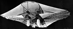 The aircraft design featured a three-part wing made of fabric that measured 26 feet (7.9 m);[1] it was powered by four sets of paddle wheels that were driven by a four-cylinder gasoline engine, while the pilot sat at the center of the machine.[3][5][6] According to Scott Gold, the airship was designed to take off horizontally, like a conventional airplane, but to land vertically, like a helicopter.[1] Robert Peoples described the aircraft's design as being reminiscent of that of a paddleboat.[5]