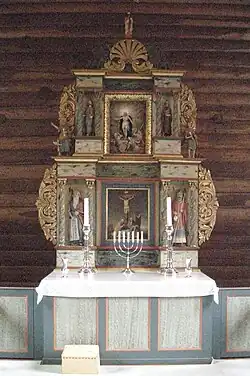 In 1748, the church received exterior paneling, it was painted reddish brown with white window frames, and the roof was tarred. In 1810, a painting by the Fåberg artist Ole Larsen Smerud was gifted to the church. It is a painting of Jesus on the cross and it was hung above the altar in the church. Smerud studied painting in Copenhagen, where he worked as a court painter and heraldic artist.[7][8][4][6]