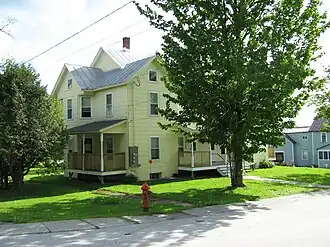The F.W. Wheeler House stands on the south side of Intervale Street, a residential side street in the village of Richford. It is a 2+1⁄2-story wood-frame structure, with a symmetrical appearance that is still characterized by details typical of the Queen Anne period, better known for its asymmetrical designs. The main roof ridge runs parallel to the street, with lower gable sections projecting to the front and sides at each end. A porch extends between the front-facing projections, supported by turned posts, and there are similar porches on the sides. The interiors of the two units are organized as mirror images of each other, and retain original woodwork, wrought iron heating grates, and other features.[2]