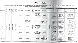 The timetables published in School Work were in fold out sections. The small foldout was for small country schools, with populations below 150 students. The large fold out was for larger, city schools, which had a population averaging 1000.