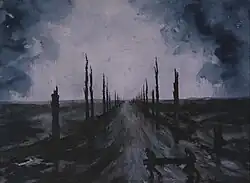 a picture of a shattered, splintered trees crying aloud ... against the horrors of it all, of dark sinister pools of mud, of a troubled sky, and of insignificant little crouching figures running across a shell-swept road