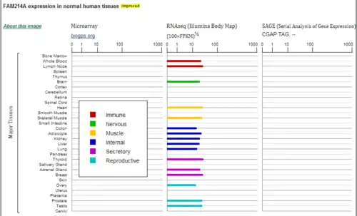 FAM214A is considered to be ubiquitously expressed (or very nearly so) in low levels according to a number of sources such as BioGPS and the Expression Atlas.[12][13][14] As can be seen in the BioGPS image below, there is a significantly higher expression level in immune-related cells and tissues, thus suggesting an immune role; however, there has been no specific in situ evidence to support this claim. Expression data has been collected from a number of studies performed on a large range of genes, therefore, some of the data is contradictory in nature.