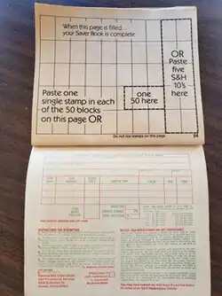 Redemption page of an S&H Green Stamps booklet. Note the language on the lower right admonishing the consumer not to buy or sell the stamps.