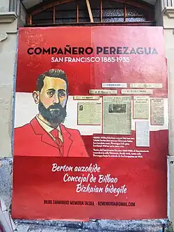 Perezagua was born in Toledo in 1860 to a working-class family. A metalworker by profession, he became an apprentice at the Toledo Arms Factory during the Third Carlist War, but was fired at its end. He later moved to Madrid, where he met Pablo Iglesias and became professionally involved in socialist politics.[1] He was sent to where he would be responsible for the spreading of socialist ideas among the workers of Vizcaya. First he conducted work among the miners of Somorrostro and later among the metalworkers of the Left Bank of the Nervión.[2] Perezagua arrived in Bilbao on 20 April 1885. With the help of other socialist militants, Perezagua was responsible for the foundation of the first socialist groups in Vizcaya. On 11 July 1886 the Bilbao Socialist Group under his leadership.[3]