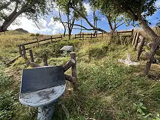 The Faha Massacre Site is located several hundred meters behind the Catholic cemetery in the village of Merizo on the United States island of Guam. The site is in a small grove of trees at the top of the rise behind the cemetery, demarcated by a perimeter of concrete pickets formed and painted to look like wood. An unmaintained trail leads to the site. A metal plaque mounted on a concrete block commemorates the thirty native Chamorro men who were slaughtered here on July 16, 1944, by members of the Imperial Japanese Army (IJA) during the Japanese occupation of the island during World War II. The IJA routinely forced Guam's native population to work on its construction projects. The men who were killed here were rounded up for a work crew; why they were killed is unclear, as there were no survivors. The massacre took place one day after the Tinta Massacre (in which 46 were killed), and about one week before the liberation of the island began.[2]