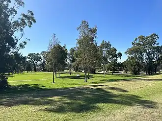 The Endeavour Sports Reserve, located near the confluence of Orphan School Creek and Green Valley Creek, is a large floodlit urban park and a sports ground that features shared soccer, cricket, league and hockey fields, and four tennis courts. The vegetation along the creek side has been identified by the NSW National Parks and Wildlife Service as a Cumberland Plain Endangered Ecological Community. The narrow woodland strip, which border the creek, feature a walking/cycling path, and are dominated by Eucalyptus moluccana and Eucalyptus tereticornis trees. Although not in the suburb, Brenan Park is adjacent to the northeastern vicinity of Fairfield West.[3]