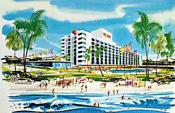 The San Juan Intercontinental opened on February 1, 1958, operated by the Intercontinental Hotels division of Pan Am.[2] It was constructed at a cost of $7.5 million by the San Juan Hotel Corporation and was designed by Miami-based architect Roy F. France, with G. Fernos Lopez serving as the San Juan-based consulting architect.[3] The 16-acre resort had 320 rooms and boasted the largest convention hall in Latin America. The hotel's Tropicoro nightclub and adjoining casino were designed by Cuban architect Max Borges Jr., in a style similar to his earlier Tropicana Club in Havana.[4]