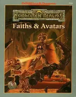 Faiths & Avatars is a supplement which lists and details information about the gods of the Faerûnian pantheon, even those who have died.[1] The book provides 45 deity descriptions, and four new priest sub-classes. Each god has a description, game statistics, and a personal history, as well as its Avatar that the god uses as a manifestation in the mortal world in a form that characters would most likely encounter. The faiths section of each god details the structure of their church, religious dogma, daily activities, major worship centers, prominent religious orders, priest vestments, adventuring clothes, holy days and significant ceremonies.[1] The book presents specific spells available only to the followers of the individual gods, which match the nature and spheres of influence for each god.[1] The last ten pages of the book outline four priest sub-classes: crusaders, monks, mystic and shamans.[1]