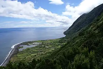 The size of the fajã has been attributed to the 9 July 1757 earthquake, considered the most violent tectonic quake that occurred in the Azores.[2][3][4] This seismic event was characterized by violent movements of land (landslides, collapses and rockfalls) that were responsible for the creation of several fajãs on the island, such as the Fajã of Ponta Nova, and the growth of pre-existing fajãs.[2] The event, and associated aftershocks, were responsible for the destruction in Fajã dos Vimes, Fajã do São João and Fajã dos Cúberes, where "it moved the land, from the centre above, with luck, in them, there is no sign of buildings."[5] The earthquake produced major damage in Calheta and caused the death of 1034 on the island of São Jorge.[5][6]