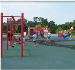 In 1999, Hadley's Park opened with a castle, a frontier village and a pirate ship. Rather than using gravel or woodchips, Hadley's Park had a rubber-based surface covering 34,000 square feet (3,200 m2) of playing surface.[5] This is one of the largest pour-in-place playing surfaces in the world.[5] The surface is durable enough for wheelchairs and walkers, yet soft enough not to hurt a child if they fall. The incorporation of high edge curbs, bright colors and braille signage supports visually-impaired children.[5]