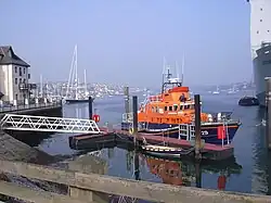 The Falmouth Docks were developed from 1858,[17] and the Royal National Lifeboat Institution (RNLI) opened Falmouth Lifeboat Station nearby in 1867. The present building dates from 1993 and also houses HM Coastguard.[18] The RNLI operates two lifeboats from Falmouth: Richard Cox Scott, a 17-metre (56 ft) Severn-class all-weather boat,[19] and B-916 Robina Nixon Chard, an Atlantic 85 inshore lifeboat.