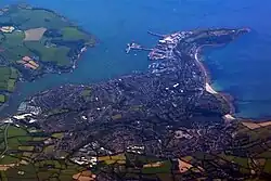 Aerial view of Falmouth: Penryn River centre left; part of Carrick Roads top; part of Falmouth Bay right