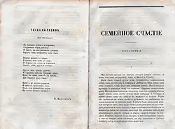 Family Happiness (pre-reform Russian: Семейное счастіе; post-reform Russian: Семейное счастие, romanized: Seméynoye schástiye) is an 1859 novella written by Leo Tolstoy, first published in The Russian Messenger.