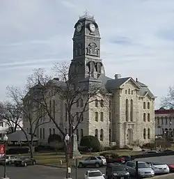 The Fannin County Courthouse is a historic courthouse building located in Bonham, Fannin County, Texas. Built in 1888-1889 of rough-cut local limestone from Gober by Scottish-born stonemasons Kane and Cormack, it was designed in the Second Empire style of architecture by Waco-based architect Wesley Clark Dodson (1829–1914) of the firm Dodson and Dudley. As built it was similar in appearance to the Hood County Courthouse Dodson designed shortly after it.[1] Its central clock tower and elaborate mansard roof were destroyed by fire on New Year's Eve, December 31, 1929, and were replaced by a flat roof.[2] In 1965 the courthouse was modernized, the remaining roof pediments were removed and the exterior was covered with a smooth surface of what is called Lueders stone or Lueders limestone, so that it appeared to be a Moderne or rather plain Art Deco building.[3] [4] [5]