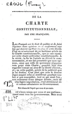 - De la Charte constitutionnelle par une Française (in French), Paris: s.n., 1814 – via BnF