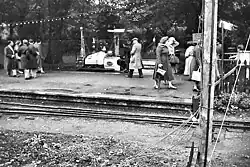 After the closure of the Festival, the Pleasure Gardens became part of Battersea Park. The railway continued on the same site until 1953; then was moved to another site in the park as the Festival Gardens Railway. In this form it was about 840 yards (760 metres) long, and ran from a station at the Queen's Gate, parallel to the Eastern and Northern Carriage Drives, to a station at Chelsea Bridge, via a "halt" at the Funfair.[3][4] It continued with other Barlow locomotives until 1975,[2] when the line closed, partially due to the decline of the funfair itself. Part of a cutting for the line is still visible near the tennis courts.[3]