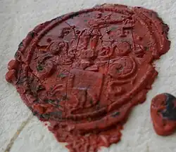 Their descendant, the nobleman János Farkas de Alsóeőr, who lived in the beginning of the 17th century, was a landowner in Kančevci (Hungarian: Felsőszentbenedek), which was located in the Vas county. This János Farkas de Alsóeőr had two sons: Lukács Farkas de Alsóeőr and Péter Farkas de Alsóeőr (fl. 1656). His son Péter Farkas (who was already very old for 1654) rented a small state in Pórszombat, which was located in the County of Zala. Péter's son, Mihály Farkas de Alsóeőr (fl. 1656–1664), who fought against the Turkish invaders was the one that bought the states in Zalaboldogfa (Boldogfa), in Zala county during the second half of the 17th century. Mihály Farkas married the local noble lady Éva Péter de Ságod, who gave birth three sons to him: János Farkas de Boldogfa, Péter Farkas de Boldogfa and István Farkas de Boldogfa. This branch of this Farkas family later used the Nobiliary particle of "de Boldogfa" as they received a royal donation to the state of Boldogfa from Charles VI, Holy Roman Emperor, King of Hungary, on 22 March 1716.[2] In the other hand, the descendants of Lukács Farkas used the Nobiliary particle "de Alsóeőr" in honor to their original state were the family hailed from and that were donated by the King on the 16th Century. On April 2 1690. the noble Farkas family that lived in Kančevci (Hungarian: Felsőszentbenedek) received the donation of a coat of arms from the King Leopold I of Hungary; this coat of arms was used by both families, the Farkas de Boldogfa and this particular branch of the family Farkas de Alsóőeőr.[3][4]
