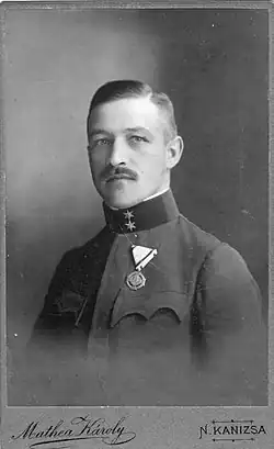 The youngest son of Ferenc Farkas de Boldogfa and Zsófia Marton de Nemsnép was Vitéz Sándor Farkas de Boldogfa (1880 –1946), a colonel of the Kingdom of Hungary. He was appointed as General Captain of the Order of Vitéz of the county of Zala in 1935. He occupied the office until 1939, when he resigned because of serious health problems.[16][17] He was a close friend of the Count Béla Teleki de Szék (1896–1969), who was the lord-lieutenant of Zala county (zalai főispán). Sándor Farkas de Boldogfa was also knight of the Order of the Austrian Iron Crown. On 22 September 1920 Sándor Farkas de Boldogfa married the noble lady Katalin Csomasz de Adorjánháza (1897–1964),[18] who played also an important social role during the World War II in the county of Zala, as she was the president of the Hungarian Red Cross of the county, and other organizations as well.[19][20] She gave birth two boys to him: Lóránd and Tamás.