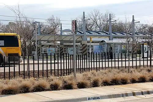 Farmers Branch station (formerly Farmers Branch Park & Ride) is a DART light rail station in Farmers Branch, Texas. It serves the Green Line.[2] The station initially opened as a bus-only park & ride facility in the 1990s. Light rail platforms opened as part of the Green Line's expansion in December 2010.