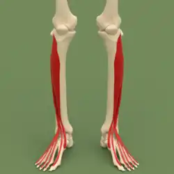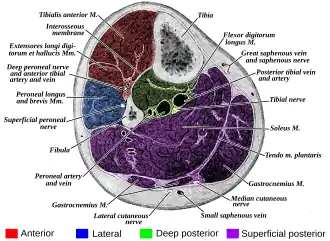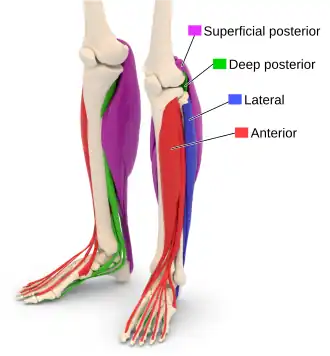 ![]() Muscles of the lower leg. Four compartments painted in different colors. | |