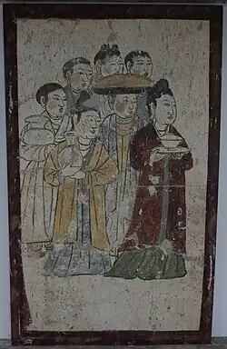 Tombs in haner families (i.e. Han Chinese of mixed origins or who have adopted some Khitan customs), for example the Zhang and Hann families, often depicts men dressed in Khitan clothing in corridors and antechambers while inner culture shows haner culture.[3] Some Han Chinese or Haner men adopted and mixed or combined Han clothing with Khitan clothing with Khitan boots and Han clothes or wearing Khitan clothes.[3]: 48, 52–53 [17] Han women on the other hand did not adopt Khitan dress and continued wearing Han dress.[3]: 48, 52–53 [17] For example, the tomb of Hann Shixun (a man from distinguished haner families) who died in the early 12th century during the late Liao dynasty depict Khitan-style clothing in the antechamber whereas women in Han Chinese-style clothing is seen in the painting found in the inner chamber.[3]: 44–45  Another example can be seen in a mural painting found in the tomb of Zhao Wenzao, where children and servants are depicted wearing Khitan hairstyles and Khitan-style clothing, while the woman who is standing behind the table is depicted in Han Chinese clothing.[3]: 46–47  During the Liao dynasty, Han Chinese women living in the Southern Division and Haner women were culture bearers, who generally preserved Han Chinese culture and continued to wear the Han Chinese clothing which was worn prior to the conquest.[3] In a tomb at Zhaitang, there are two female servants depicted standing by the doorway wearing Chinese clothing.[6]