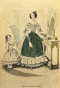 It was a common assumption in the antebellum United States that "Character is displayed, yes! moral taste and goodness, or their perversion, are indicated in dress."[11] Some influential Americans, including Godey's editor Sarah Josepha Hale, expressed concern about the effect of luxurious European fashions on the republican virtues of their countrywomen, and sought to promote simplicity and refinement as the defining trait of American style. However, the subscriber-driven and increasingly competitive market for periodicals meant that fashion plates would become increasingly common throughout the 1840s. To resolve this political problem, periodical editors increasingly touted their fashion plates as original creations, citing New York City or Philadelphia, the fashion capitals of the nation, as inspiration.[10]